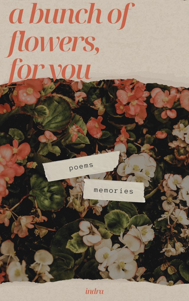 a bunch of flowers, for you is a collection of twelve poems about love, friendship, and the slow, sublime heartbreak of forgetting. These poems live in the aftermath of memory — where faces fade, voices blur, and what once was love becomes something softer, unnamed. They are about how loss can ache and still be beautiful, how forgetting can wound and still let us live. Each piece is a fragile offering, gathered from what remains — a bunch of flowers, for you.