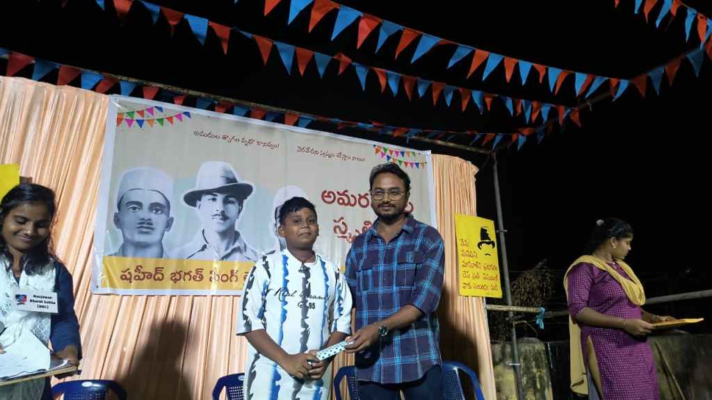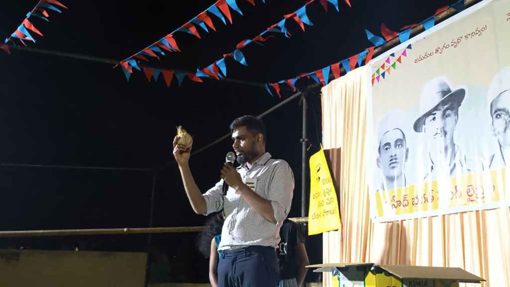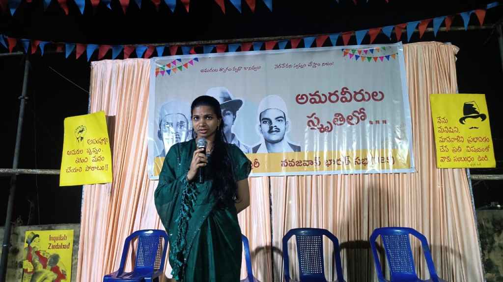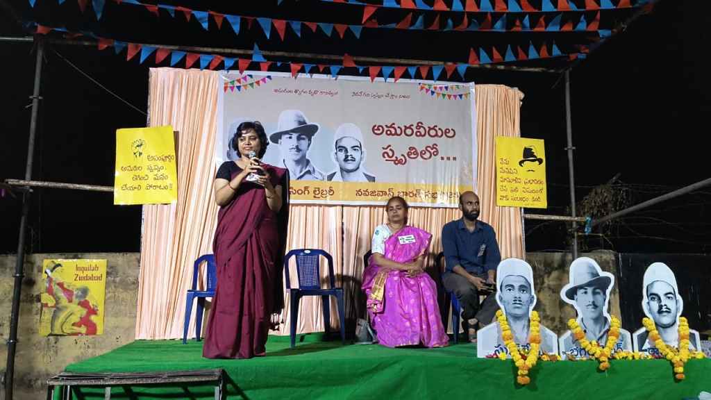 As Teja akka stood on the stage under the lights in the night, for me, it was like watching a beloved celebrity. “They say Bhagat Singh is an impulsive revolutionary,” she was saying, blazing like fire in her maroon saree. “But is he just that? Why does popular narrative portray him only as an impulsive, aggressive, and violent leader? He was more than that. He was a political thinker, a philosopher.” She stopped. She eyed the crowd. There were about fifty children seated on the ground and another fifty adults sitting in chairs. The breeze was light, and the hanging posters around the little arena of this meeting were fluttering gracefully—showcasing the lives of Bhagat Singh, Raj Guru, and Sukh Dev—whose death anniversary the Shahid Bhagat Singh Library of Vizag was “celebrating” that night in the fishermen colony of Jaalari Peta in Vizag. The remark of “celebration” was specially mentioned by Sujan, the young, soft-spoken, semi-saintly leader of the Shahid Bhagat Singh Library of Jaalari Peta, Vizag. As Teja akka eyed the crowd for a long moment, I hoped her eyes would meet mine. I thought I could express my admiration for her while she was on the stage, but nah, she didn’t catch me. To my surprise, she abruptly ended her speech by making a casual remark on how we need to learn history to really understand the narratives that are made about historical figures, only what is expected of a history lecturer like her. I clapped enthusiastically, as did J.P., the godfather or whatever, for all multitudinous socialist activities that happen in Vizag under the party banner of the N.S.P.—New Socialist Praxis.